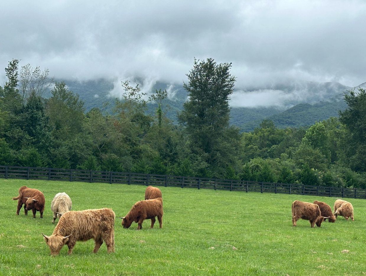 Explore the tranquil pastures of our Scottish Highland Cattle amidst North Georgia's scenic beauty.